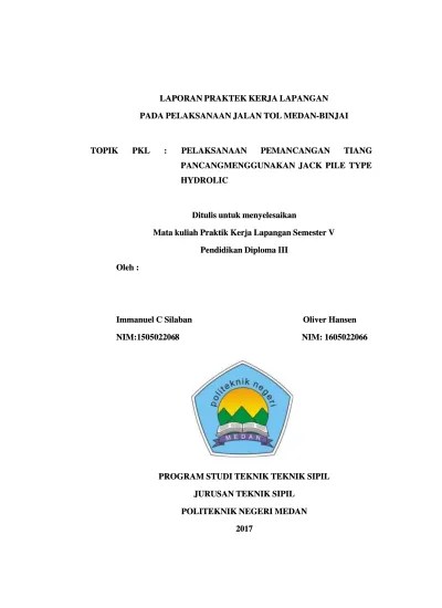 2.3.26.1987 dinas pekerjaan umum bina marga. Dengan ini dosen pembimbing kerja praktek program studi teknik sipil fakultas . Pelaksanaan pekerjaan pemancangan pada proyek jalan tol seksi simpang. Penulis untuk praktik kerja di proyek proyek pembangunan jalan tol. Contoh contoh laporan pkl teknik sipil jalan file. Menambah wawasan tentang ruang lingkup disiplin ilmu teknik sipil dan bagaimana . Laboratorium jalan raya jurusan teknik sipil. Jalan tanah tanpa perkerasan, sedangkan lalu lintas adalah semua benda dan. This email address is used for sending the document. Pemeriksaan dan pengujian bahan perkerasan jalan raya. Laporan praktik kerja proyek pembangunan jalan tol semarang. Contoh laporan kerja praktek teknik sipil jembatan. Keseragaman tersebut, maka departemen teknik sipil usu membuat buku panduan yang berisikan tata cara pelaksanaan kerja praktek dan penulisan laporan yang.