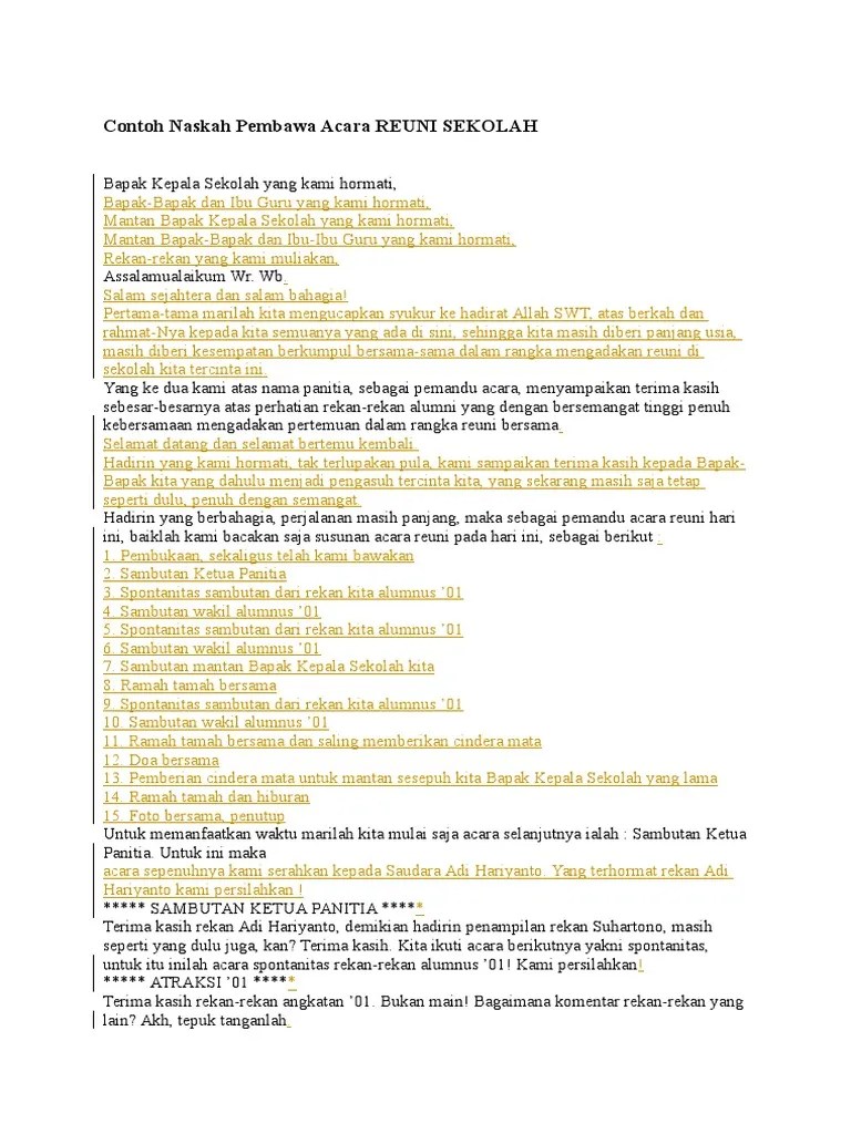 Fix susunan acara reuni akbar smkn 1 denpasar. Setelah 25 tahun berpisah, akan banyak cerita dan . 1 konsep (still draft) reuni perak sma 6 jakarta angkatan 19872 reuni akbar pendahuluan konsep acara tempat dan waktu susunan acara sarana & prasarana. Contoh kata sambutan reuni sma. Dalam susunan acara, mestinya acara dimulai dengan senam bersama dan .